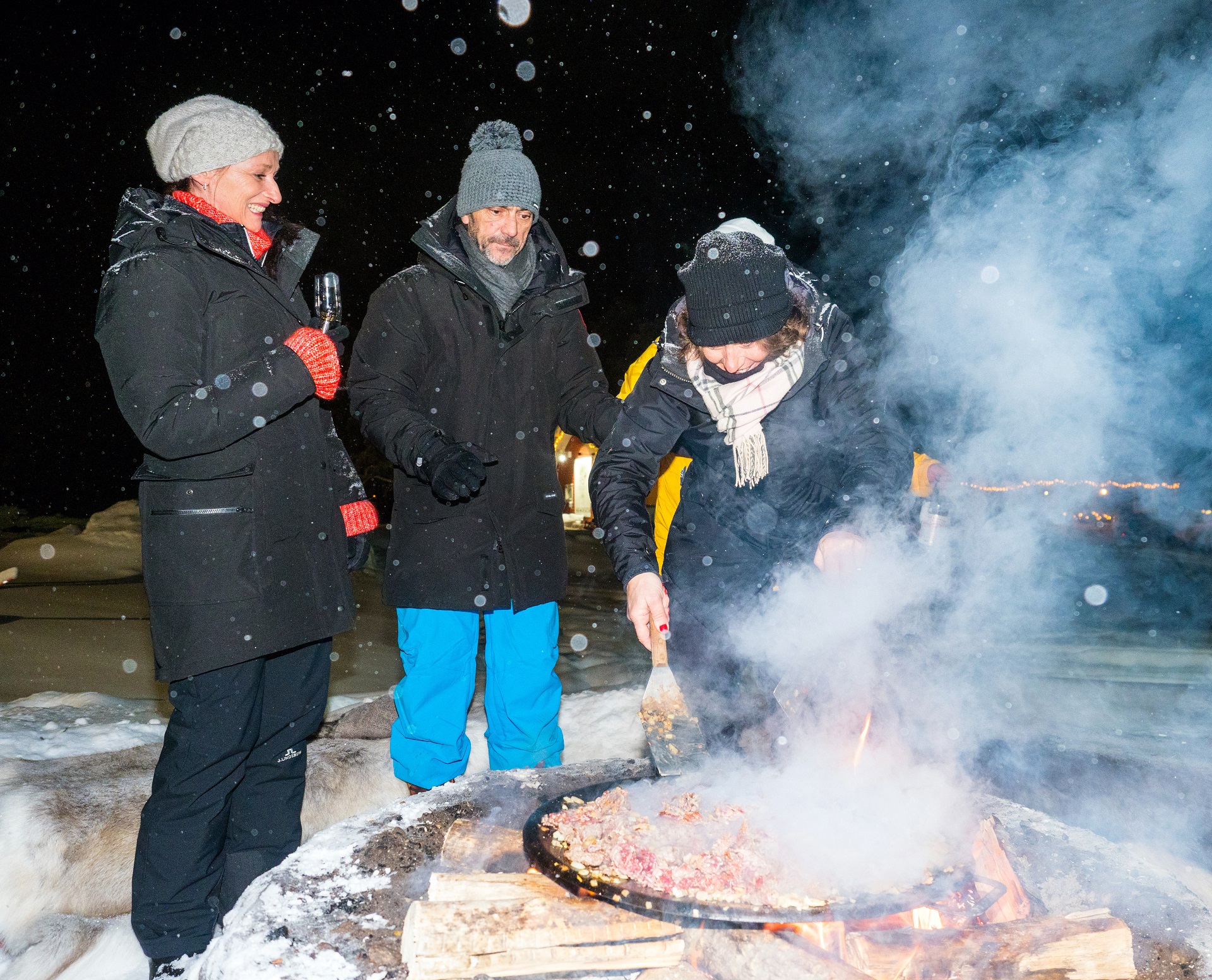 Le style de vie à la suédoise et l'hospitalité suisse se serrent la main au lodge Norrsken. C'est simple et décontracté. Tout le monde peut, personne n'est obligé. Mäx organise, téléphone, planifie et ne s'accorde aucun répit jusqu'à ce que tous les souhaits aient été exaucés. Sa planification est lancée, d'une façon ou d'une autre, elle fonctionne toujours. À midi, il y a une soupe chaude dans le salon Sami avec des chandelles et un feu de cheminée. Le soir, un dîner à trois plats au restaurant - sans carte de menu. Mäx s'assure personnellement que le végétarien ait une alternative savoureuse et que seules les personnes qui le souhaitent aient du poisson ou de l'élan dans leur assiette.
