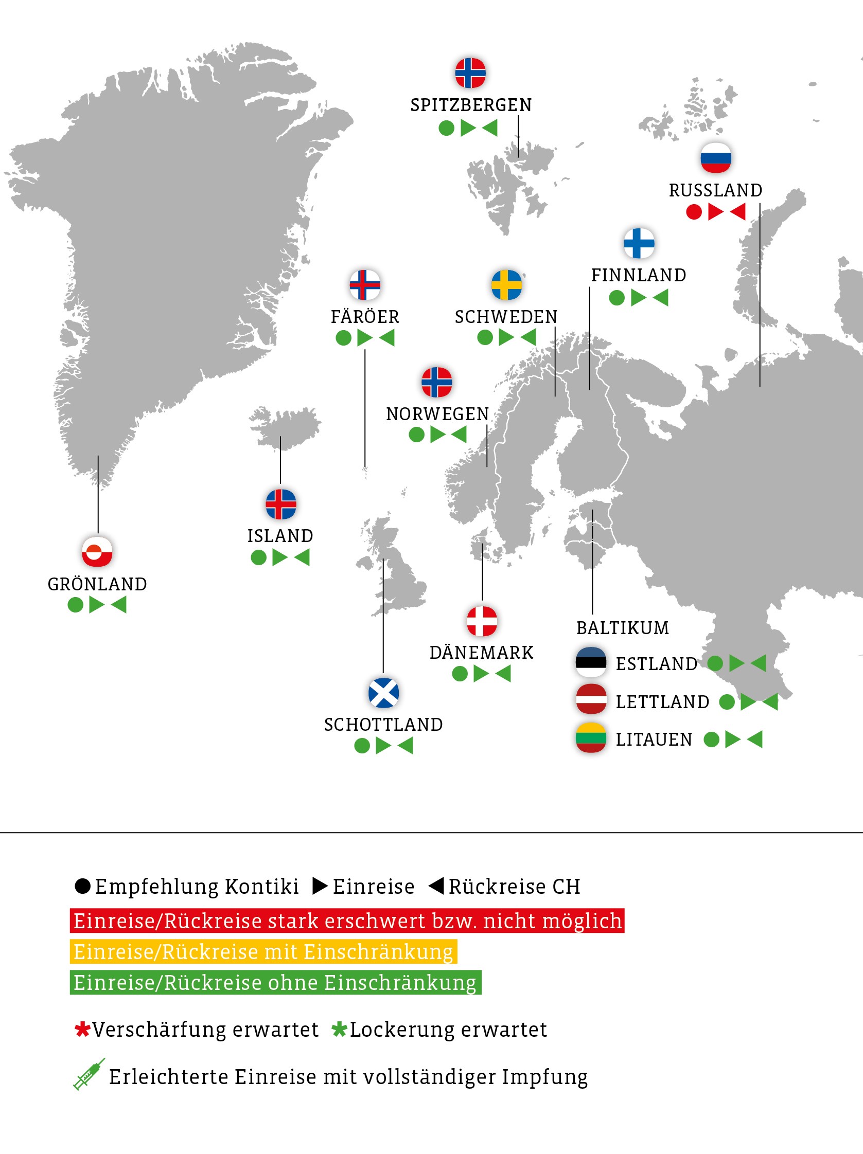Rege Kontakte mit unseren Partnern vor Ort und die Beobachtung der relevanten Informationen ergeben für uns bei Kontiki ein Bild, das wir mittels dieser Übersichtskarte jeweils aktuell darstellen. Die aufgeführten Bedingungen bzw. Einschätzungen (gültig für Schweizer Pass, mit Wohnsitz in der Schweiz, für Reisen ab der Schweiz) können jederzeit ändern: