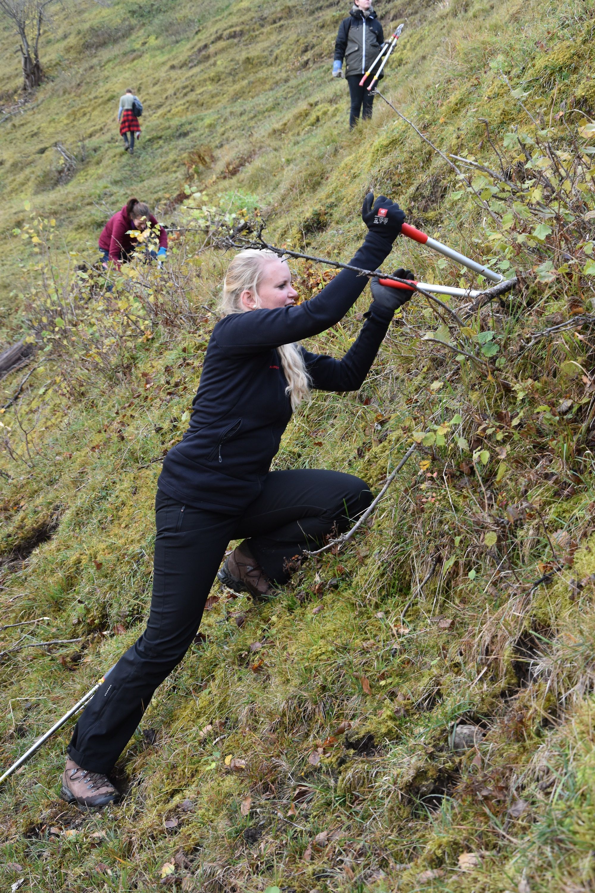 Dann ging es an die Arbeit. Wir rissen das lästige Unkraut Blacken heraus, schnitten Birken und weiteres Gehölz zurück und trugen es in den umliegenden Wald. Die Mitarbeitenden schätzen nebst dem Tag in der Natur und des neu gewonnen Wissens vor allem auch den abteilungsübergreifenden Austausch untereinander.